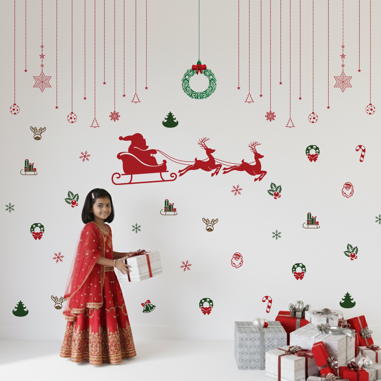 Christmas wall stickers featuring Santa sleigh, reindeer, wreaths, snowflakes, and festive hanging ornaments on a kids room wall